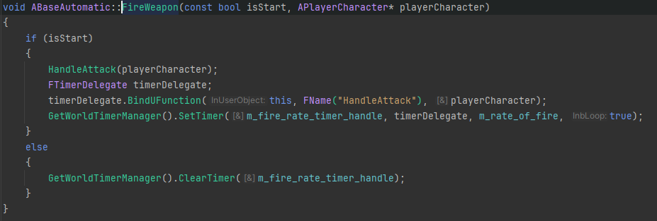 m_rate_of_fire. - Semi-automatic weapons use a boolean flag and an Unreal timer to enforce a delay between shots.